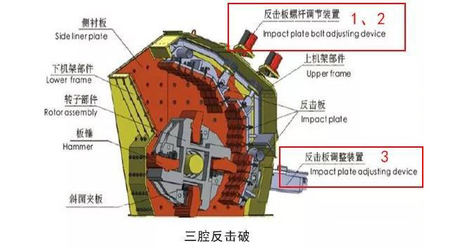 調(diào)整反擊架與轉(zhuǎn)子架之間的間隙可達到改變物料出料粒度和形狀的目的。、二反擊板通過頂部螺桿調(diào)節(jié)裝置,若存在第三塊反擊板(歐版反擊破),則通過墊片調(diào)節(jié)。