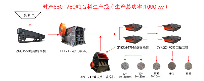 以常見的時(shí)產(chǎn)700左右顎式破碎機(jī)石料生產(chǎn)線配置舉例,工藝流程如上圖所示,大塊物料經(jīng)料倉連續(xù)、均勻的輸送到DLEV125顎式破碎機(jī)中進(jìn)行初級(jí)破碎,破碎后的一部分物料直接進(jìn)入篩分環(huán)節(jié),一部分物料輸送到XPC1213錘式反擊破碎機(jī)中細(xì)碎整形,而后進(jìn)入篩分環(huán)節(jié),篩分出來不符合成品料粒度要求的被返料帶返回二級(jí)破碎機(jī)再次加工,形成一個(gè)閉路循環(huán),設(shè)備配置可以根據(jù)項(xiàng)目實(shí)際需求靈活配置。