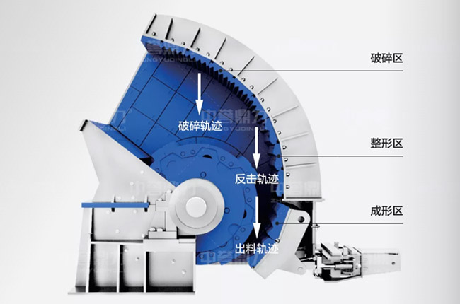 原理詳解:原料由振動(dòng)給料機(jī)送入機(jī)腔,錘頭轉(zhuǎn)子的帶動(dòng)下高速旋轉(zhuǎn),對(duì)物料進(jìn)行一次打擊,物料在錘頭的沖擊作用下被破碎;物料在錘頭的沖擊力下獲得動(dòng)能,后高速撞向機(jī)腔內(nèi)壁的反擊板,被再次破碎;在整個(gè)過程中,物料之間也會(huì)形成相互撞擊的力;當(dāng)物料粒度小于出料口間隙時(shí),自動(dòng)排出破碎腔。