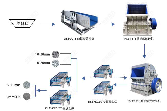 以上是時產(chǎn)600噸左右的石灰石錘式破碎工藝流程圖,圖中清晰看到,采用的是兩段破碎工藝,物料由振動給料機送入PCZ1615重型錘式破碎機做粗碎,粗碎后的物料部進入PC1213整形錘式破碎機進行細碎和整形,經(jīng)過兩道篩分,篩分出4種不同規(guī)格的成品料。