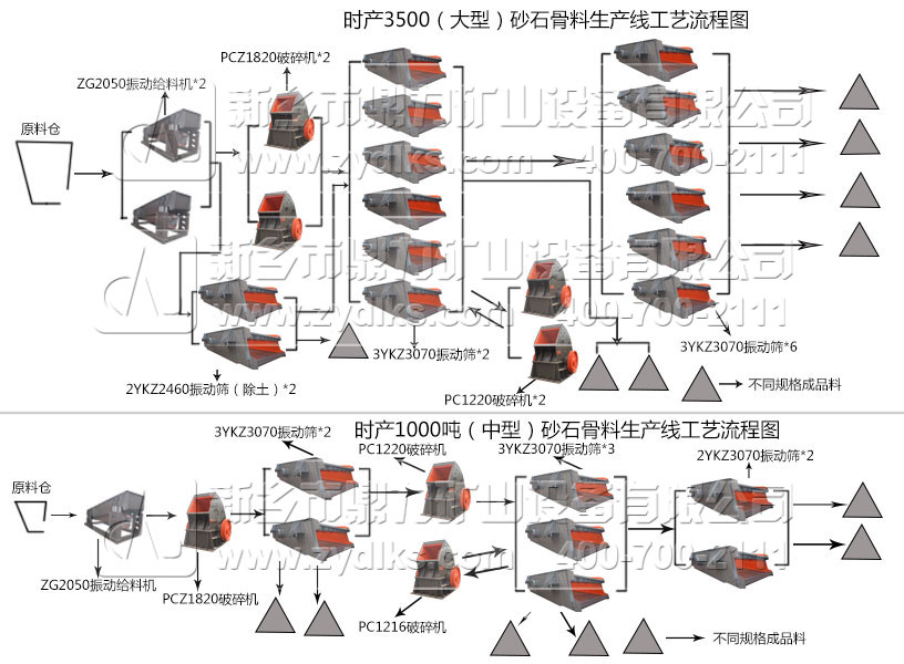 3500噸石料生產(chǎn)線使用兩臺(tái)振動(dòng)給料機(jī)同時(shí)進(jìn)行均勻給料工作,同時(shí)還可將類似于雜土等物料進(jìn)行初步篩分。物料進(jìn)入兩臺(tái)破碎機(jī)進(jìn)行初級(jí)破碎,破碎物料經(jīng)6臺(tái)振動(dòng)篩進(jìn)行篩分工作,出一部分滿足粒度的物料,不滿足物料被運(yùn)送至二級(jí)破碎設(shè)備進(jìn)行二次破碎,破碎物料再接連進(jìn)入12臺(tái)振動(dòng)篩進(jìn)行篩分,砂石料。