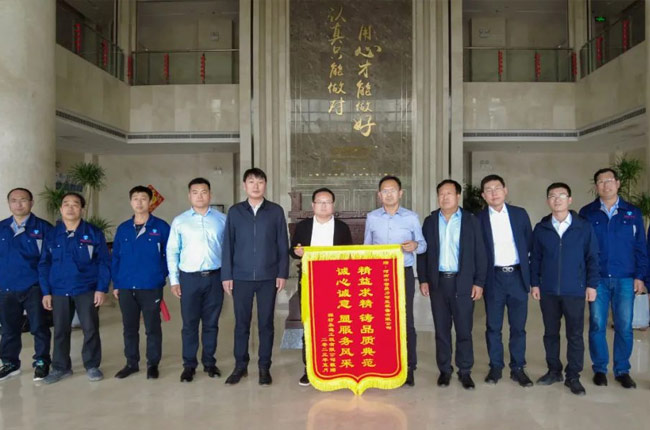 考察團來到中譽鼎力廠區(qū)后,首先送上了感謝錦旗,盛贊中譽鼎力“精益求精,鑄品質(zhì);誠心誠意,顯服務(wù)風(fēng)采”。