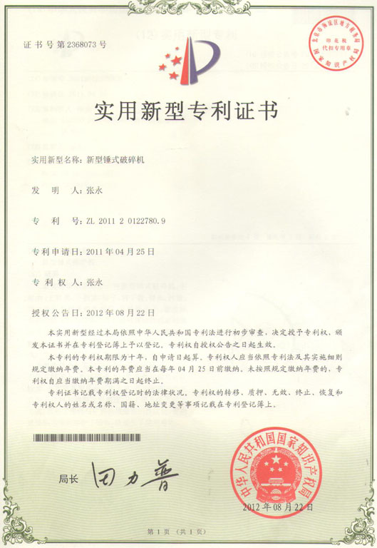 熱烈祝賀新鄉(xiāng)鼎力錘式破碎機喜獲家三項