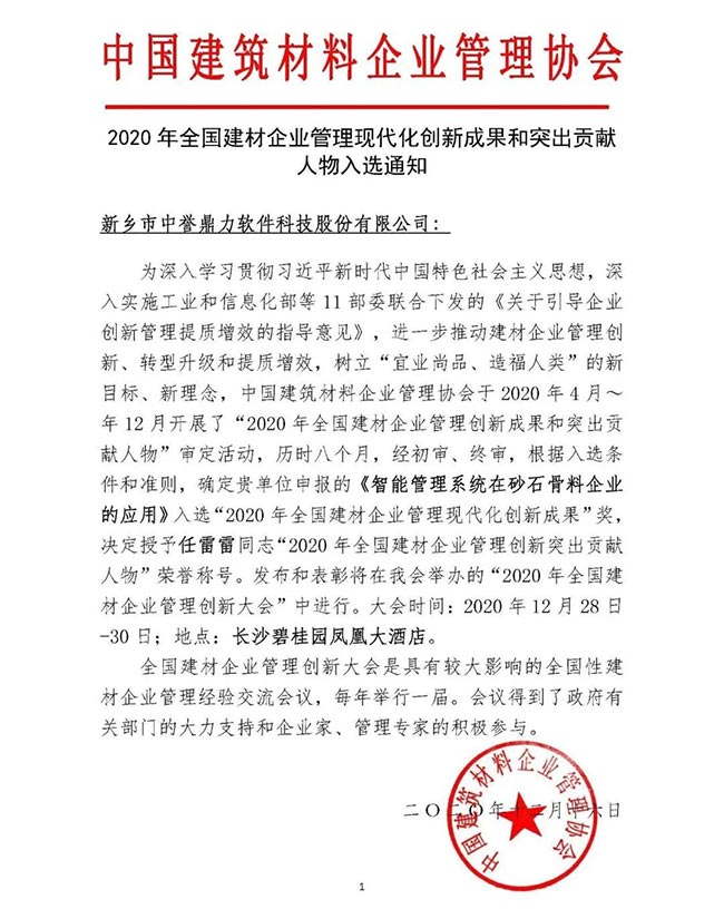 新鄉(xiāng)市中譽(yù)鼎力軟件科技股份有限公司作為礦山智能管理技術(shù)企業(yè)應(yīng)邀參會(huì),并憑借“智能管理系統(tǒng)在砂石骨料企業(yè)的應(yīng)用”獲評(píng)“2019-2020年度建材企業(yè)管理現(xiàn)代化創(chuàng)新成果”典型案例獎(jiǎng);公司常務(wù)副總經(jīng)理任雷雷被授予“2019-2020年度建材企業(yè)管理創(chuàng)新突出貢獻(xiàn)人物”稱號(hào)!