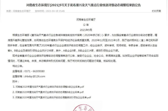 近日,河南省生態(tài)環(huán)境廳公布了《關(guān)于發(fā)布重污染天氣重點(diǎn)行業(yè)績效評級動態(tài)調(diào)整結(jié)果的公告》([2021]5號),河南中譽(yù)鼎力智能裝備有限公司成功入選2020年重污染天氣重點(diǎn)行業(yè)績效評級動態(tài)調(diào)整B級企業(yè)名單,并順利通過公示!