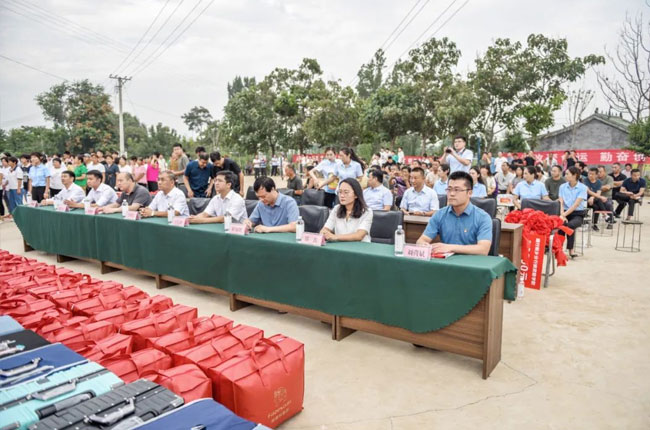 8月26日下午,衛(wèi)輝市委常委、辦公室主任、太公鎮(zhèn)黨委書記胡良,衛(wèi)輝市副市長孫建明,衛(wèi)輝市政協(xié)副主席崔福明,共青團衛(wèi)輝市委書記鄭鑫,衛(wèi)輝市教育局局長孫西,衛(wèi)輝市教育局副局長焦元玉,衛(wèi)輝市太公鎮(zhèn)黨委副書記、鎮(zhèn)長劉營斌,周邊32個村支部書記、受資助學生及家長、村民代表共計200余人參加捐贈儀式。