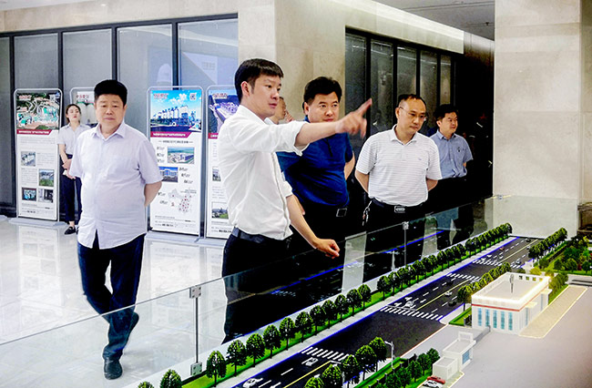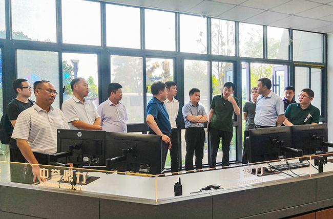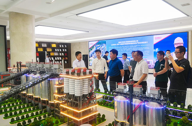 隨后,考察團一行來到河南中譽鼎力智能裝備有限公司,實地參觀了中譽鼎力礦山管理云數據和多位一體循環(huán)建材產業(yè)園項目沙盤,并進行座談。