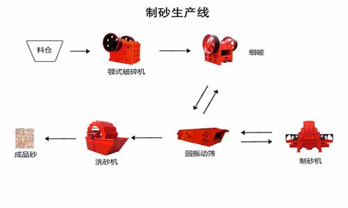 一般制砂生產(chǎn)線由破碎制砂設(shè)備和輔助設(shè)備共同構(gòu)成,其中破碎制砂設(shè)備根據(jù)流程依次為:顎式破碎機(jī)(粗破)、圓錐式破碎機(jī)/反擊式破碎機(jī)(細(xì)破)、制砂機(jī) ,分三個(gè)破碎等級對物料進(jìn)行加工處理。輔助設(shè)備一般有:給料倉、振動(dòng)給料機(jī)、傳輸皮帶機(jī)、振動(dòng)篩、洗砂機(jī)。