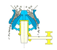 圓錐式破碎機(圓錐破碎機)工作時,電動機的旋轉通過皮帶輪或聯軸器、傳動軸和圓錐部在偏心套的迫動下繞一固定作旋擺運動,從而使圓錐破碎機的破碎壁時而靠近又時而離開固裝在調整套上的軋白壁表面,使礦石在破碎腔內不斷受到沖擊,擠壓和彎曲作用而實現礦石的破碎。
