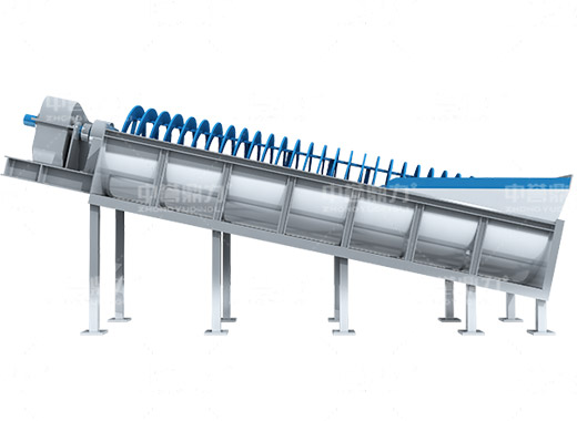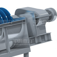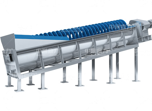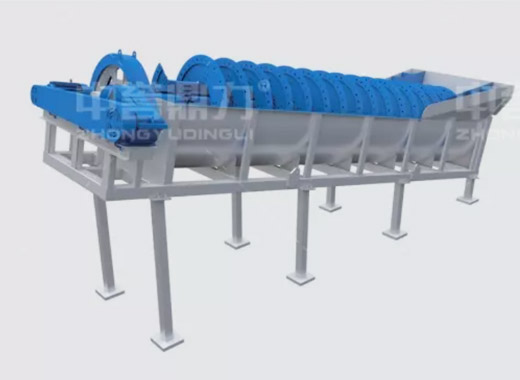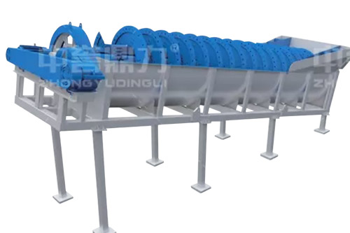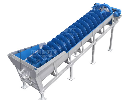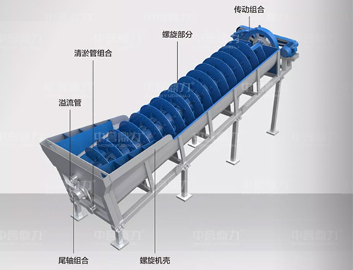 電動機帶動螺旋開始轉(zhuǎn)動,砂石進入到水洗槽中,在螺旋葉片的帶動下翻轉(zhuǎn),砂石快速的與水?dāng)嚢枞诤,使物料中的泥土等雜質(zhì)與砂分離,清洗掉的雜質(zhì)隨著溢流管流出,清洗干凈的砂石在螺旋葉片的帶動下,推到高出的出料口排出水洗槽,完成砂石清潔。