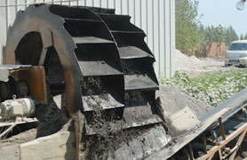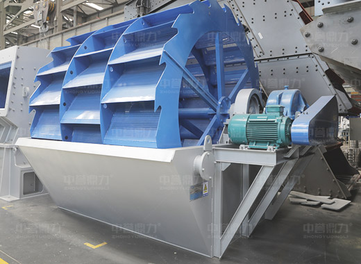 洗砂機(jī)工作時(shí),電機(jī)通過三角帶、減速機(jī)、齒輪減速后帶動(dòng)葉輪緩慢轉(zhuǎn)動(dòng),砂石由給料槽進(jìn)入洗槽中,在葉輪的帶動(dòng)下翻滾,并互相研磨,除去覆蓋砂石表面的雜質(zhì),同時(shí)破壞包覆砂粒的水汽層,以利于脫水;同時(shí)加水,形成強(qiáng)大水流,及時(shí)將雜質(zhì)及比重小的異物帶走,并從溢出口洗槽排出,完成清洗作用。干凈的砂石由葉片帶走,后砂石從旋轉(zhuǎn)的葉輪倒入出料槽,完成砂石的清洗作用。