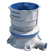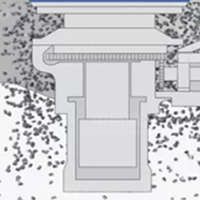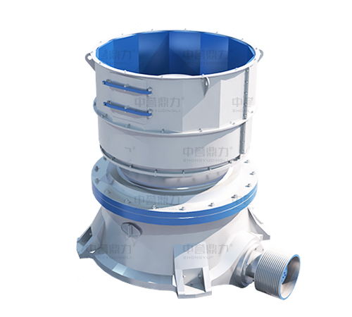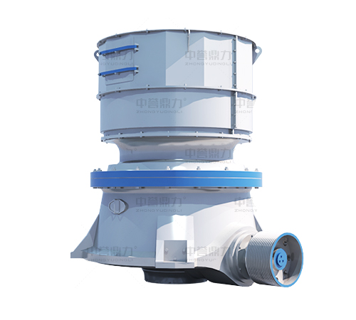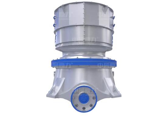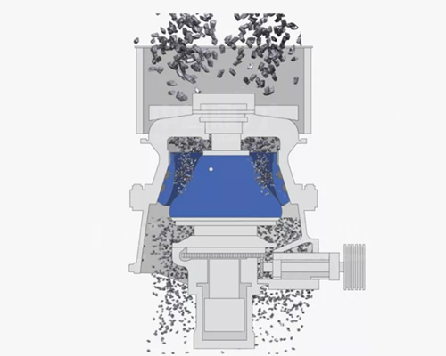 水平軸在電機(jī)帶動(dòng)下旋轉(zhuǎn),通過齒輪帶動(dòng)偏心套旋轉(zhuǎn),偏心套帶動(dòng)動(dòng)錐做圓錐擺動(dòng),與定錐形成連續(xù)擠壓,達(dá)到破碎石塊的目的。 通過調(diào)整動(dòng)錐底部的液壓缸,可以使動(dòng)錐上下運(yùn)動(dòng),從而控制排礦口的大小,進(jìn)而達(dá)到調(diào)成產(chǎn)品粒度大小的目的。液壓缸具有過鐵保護(hù)功能,當(dāng)有不可破碎物進(jìn)入破碎腔,液壓缸控制動(dòng)錐下落,不可破碎物下落排出后,動(dòng)錐自動(dòng)恢復(fù),設(shè)備恢復(fù)到正常工作狀態(tài)。