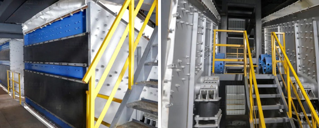 頭破采用DLPCZ1820重型錘式破碎機(jī),破碎出來的物料經(jīng)過中轉(zhuǎn)料倉,進(jìn)入由2臺(tái)DLPC1220整形錘式破碎機(jī)組成的二級破碎環(huán)節(jié),之后再進(jìn)行2道篩分,不滿足成品料粒度要求的被返回到二級破碎環(huán)節(jié),輸送帶采用廊道密封,解決物料輸送過程中粉塵擴(kuò)散問題,破碎、篩分車間均采用鋼結(jié)構(gòu)獨(dú)立密封,解決破碎篩分環(huán)節(jié)的粉塵擴(kuò)散問題。