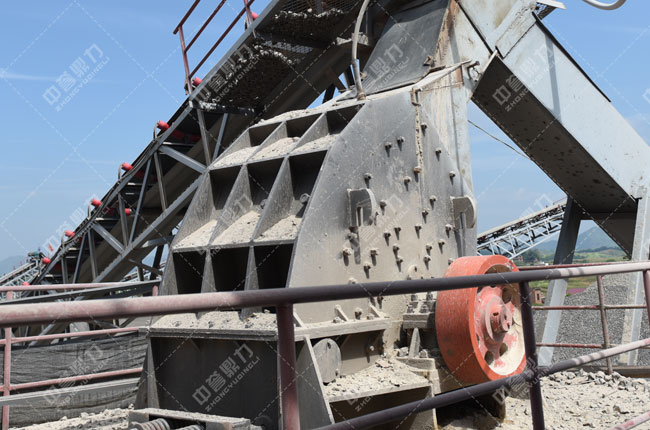 大塊石料經料倉均勻、連續(xù)的送到PCZ1512重型錘式反擊破碎機進行粗碎,粗碎后的物料經輸帶送到一臺2YKZ2460振動篩進行篩分,篩分出一種20-30成品石子,大于31.5mm的料被一套輸送帶返回進行再次破碎,小于31.5的碎石被輸送到一臺2YKZ2460進行篩分,篩分出10-30、5-10和石粉三種成品料。
