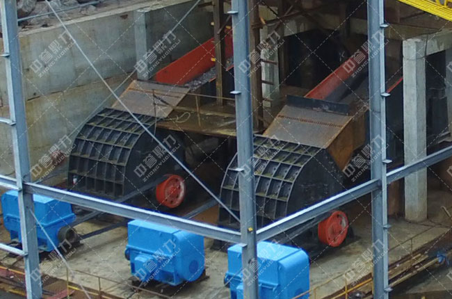 大塊石料經(jīng)ZGC2050振動(dòng)給料機(jī)均勻、連續(xù)的送到PCZ1620重錘破進(jìn)行破碎,破碎后的物料被送到中轉(zhuǎn)料倉(cāng),再由兩臺(tái)ZGC2038給料機(jī)送到兩臺(tái)PC1220整形錘破進(jìn)行整形加工,經(jīng)過再次加工的物料被輸送到一組3臺(tái)3YKZ3070振動(dòng)篩進(jìn)行篩分,篩分出1-3以下的石料、土石粉和一部分回料,1-3以下的料被輸送到下一組3臺(tái)3YKZ3070振動(dòng)篩進(jìn)行再次篩分,回料被返料帶返回整形錘破進(jìn)行再次破碎,形成一個(gè)閉路循環(huán),終篩分出1-3/1-2/0-5和石粉四種成品料。
