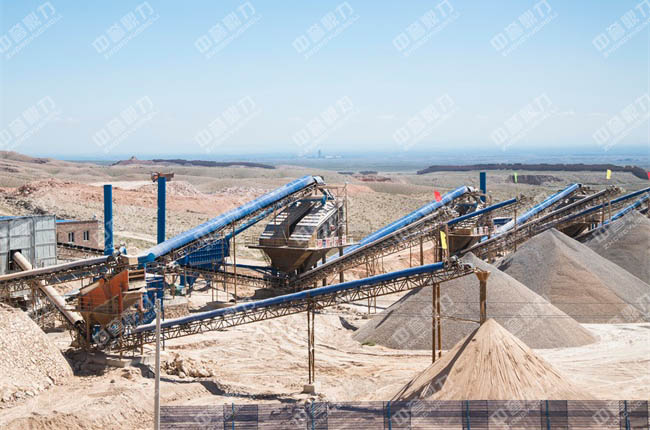 大塊石料經(jīng)ZGC1538振動(dòng)給料機(jī)均勻、連續(xù)的送進(jìn)頭破PCZ1615重型錘式反擊破碎機(jī)進(jìn)行粗破,破碎后的物料由皮帶輸送機(jī)送至一道并篩3YKZ3070振動(dòng)篩進(jìn)行篩分,篩分出來(lái)的大塊物料被一條輸送帶送到二破XPC1220錘式破碎機(jī)進(jìn)行進(jìn)一步破碎,與頭破出來(lái)的另一部分料一起被主輸送帶送至道并篩3YKZ2460和第三道并篩2YKZ2460進(jìn)行篩分,篩分出幾種不同規(guī)格的成品料被輸送帶送到成品料堆。