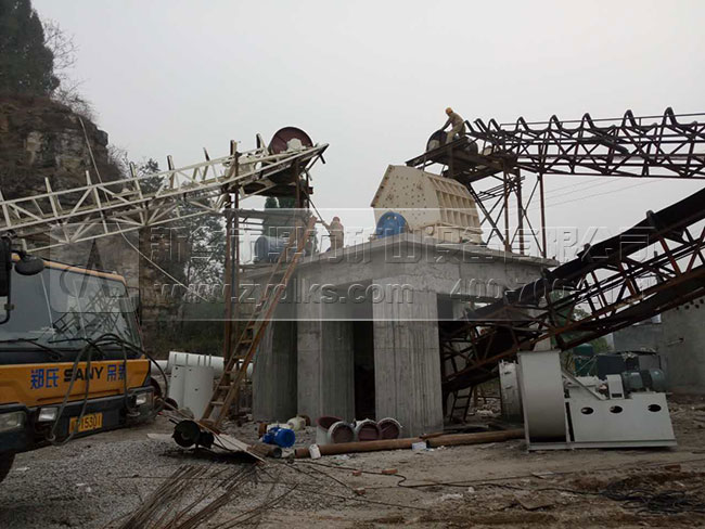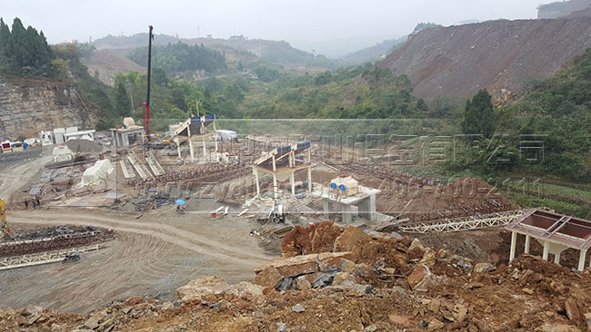 此條時產600噸砂石料生產線主要包括2臺重錘破、11臺篩分設備、2臺ZSJ1218制砂機,并且配備有完備的中轉倉和環(huán)保除塵設備,設備產能是比較大,預計設計的產能是500噸,在實際的生產中達到了600-700噸,生產效果良好。