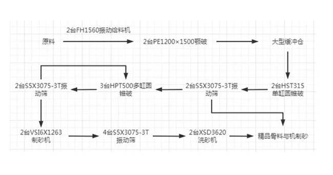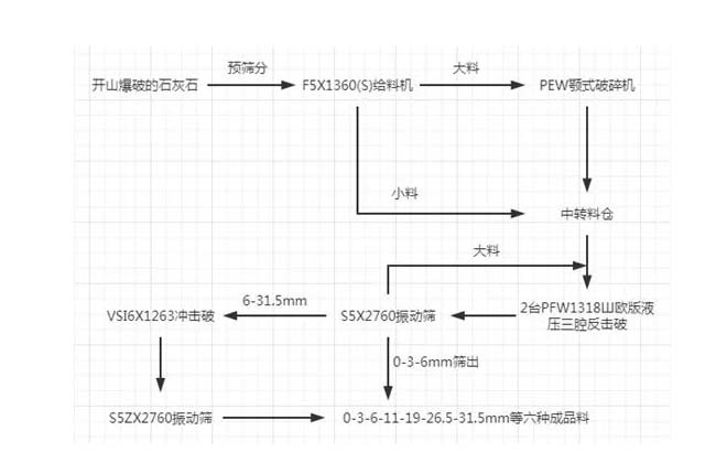 主機(jī)設(shè)備:PEW顎式破碎機(jī)、2臺(tái)PFW反擊破碎機(jī)、VSI6X制砂機(jī)