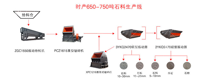 選用設(shè)備:ZG2050振動給料機,PCZ1820重型錘式破碎機,PCZ1620整形破碎機,3YKZ3070振動篩*3,2YKZ3070振動篩*2和輸送帶等設(shè)備。