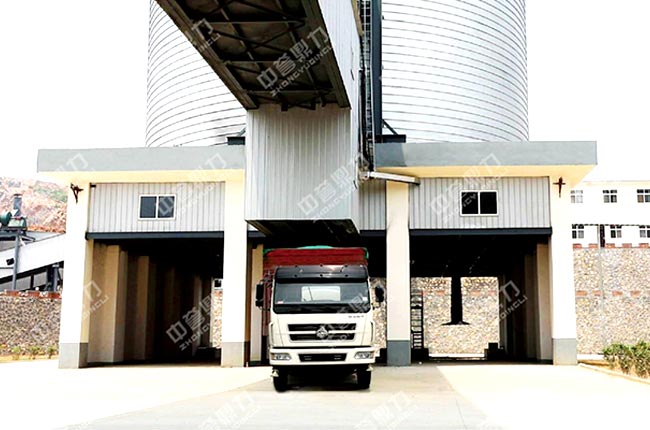 石料自動裝車系統正在運行,整個過程不需要工作人員,自動裝車,石料裝滿后自動停止放料