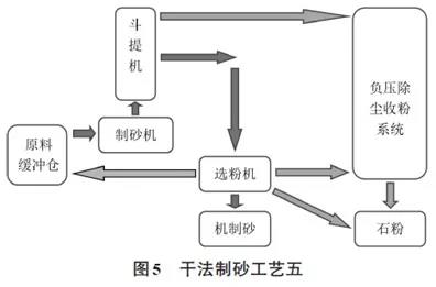 圖5表示砂石分選設備布置在制砂機出料位置,無震動篩分工序,利用砂石分選設備做出除粉以及出砂。